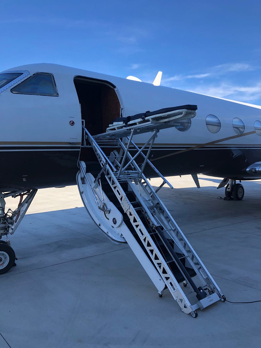 This loader allows the crew to load a large patient or incubator into the aircraft without any lifting at all. By utilizing the 28-volt DC outlet on the front of the Spectrum Aeromed module this loader can safely and easily lift 650 pounds. It takes less than five minutes to set up and when not in use, the loader folds and stores in the cargo area. The electric loader’s legs can be sized to any aircraft, from the tall Challenger 604 to the smaller King Air.